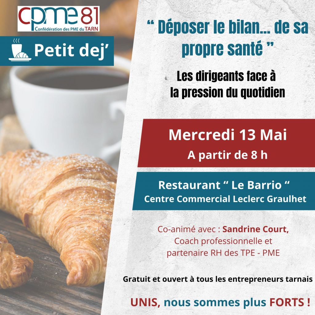 Avec toute l’équipe de la CPME du Tarn, nous vous donnons rendez-vous pour un petit déjeuner gratuit et ouvert à tous les dirigeants tarnais.